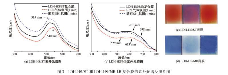 圖3(a)和3(b)分別顯示的是LDH-HS/ST和LDH-HS/MB多層LB復合膜沉積在石英底片上測得的UV光譜,以及經1 min HCl氣體氛圍處理后和1 min NH3氣體氛圍處理后的UV變化光譜圖。圖3(c)和3(d)對應展示了LDH-HS/ST和LDH-HS/MB復合膜酸堿氣體氛圍下石英片顏色變化前后對比圖。