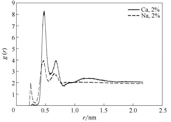 進一步分析OPES對Na+、Ca2+抗鹽性的差別,考察了磺酸基中的氧原子與Na+、Ca2+的徑向分布函數,如圖11所示。圖中兩曲線的峰值出現較大差距,其中Na+曲線的峰值明顯小于Ca2+曲線的峰值,這表明親水基團與Na+的作用較小,也就是說Na+對OPES的性質影響較小。因此,辛基酚聚氧乙烯醚磺酸鹽的抗鹽性順序為Na+>Ca2+,與對序參數所做的分析結論相同。