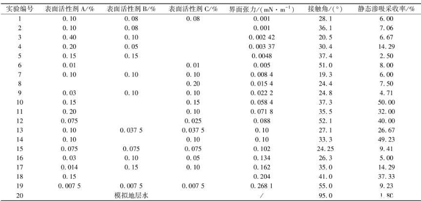 根據(jù)國內(nèi)外學(xué)者的研究,滲吸液對滲吸的影響主要是改變油水界面張力、潤濕性、乳化性和pH值。乳化性主要是通過乳化分散,從而增強(qiáng)油滴在巖心孔道內(nèi)的流動能力;pH值則主要是影響滲吸液的乳化能力。本次實驗采取靜態(tài)滲吸的方式,乳化性的作用相對較小,故滲吸液配制指標(biāo)為界面張力與潤濕性。