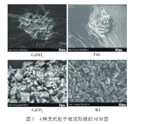 4種無機粒子的表觀形貌如圖1所示,可以看出,CaSiO3顆粒為多孔蜂窩狀結(jié)構(gòu),Talc顆粒形狀為偏平形,CaCO3顆粒形狀不規(guī)則,WI多為針狀形顆粒。