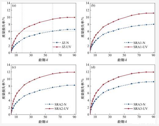 暴露在強(qiáng)紫外線輻射環(huán)境中的各組試樣的質(zhì)量損失率均明顯大于標(biāo)準(zhǔn)干燥環(huán)境中試樣的質(zhì)量損失率。在3~21 d齡期內(nèi),各組試樣在強(qiáng)紫外線輻射環(huán)境中的質(zhì)量損失增長速率明顯大于其在標(biāo)準(zhǔn)干燥環(huán)境中的質(zhì)量損失增長速率。以基準(zhǔn)組(JZ)為例,強(qiáng)紫外線輻射環(huán)境下水泥石在18 d齡期時(shí)的質(zhì)量損失率達(dá)到標(biāo)準(zhǔn)干燥環(huán)境下水泥石在60 d齡期時(shí)的質(zhì)量損失率(穩(wěn)定值),并最終在90 d齡期時(shí),JZ-UV組的質(zhì)量損失率達(dá)到了JZ-N組的1.5倍。這是強(qiáng)紫外線輻射的“光化學(xué)作用”引起的。當(dāng)水分子吸收光子后,內(nèi)部的電子會(huì)發(fā)生能級(jí)躍遷,形成不穩(wěn)定的激發(fā)態(tài),并發(fā)生離解反應(yīng),使H—O鍵斷裂生成H+和HO-,從而加速水分子的運(yùn)動(dòng),促進(jìn)了水泥石表面的干燥,增大了水泥石體系內(nèi)部與外部環(huán)境的濕度梯度,導(dǎo)致水泥石中的水分快速散失。