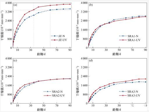 比較2種環(huán)境下各組試樣的干縮變形變化規(guī)律,發(fā)現(xiàn)基準(zhǔn)組與SRA試驗(yàn)組呈現(xiàn)出不一樣的變化趨勢(shì)。由圖4可知,在強(qiáng)紫外線輻射環(huán)境下,基準(zhǔn)組(JZ)在3~21 d齡期內(nèi)的干縮速率遠(yuǎn)高于其在標(biāo)準(zhǔn)干燥環(huán)境下的干縮速率,最終表現(xiàn)為JZ組在強(qiáng)紫外線輻射環(huán)境下的干縮變形增加,說明在溫度和濕度一致的條件下,強(qiáng)紫外線輻射會(huì)增大水泥石的干縮變形。