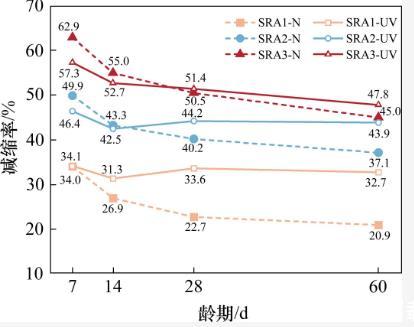 從圖3中可以觀察到,隨著齡期的延長,干縮曲線SRA2-UV逐漸接近于干縮曲線SRA3-UV,而SRA3-UV的干縮值沒有進(jìn)一步降低。這表明上述分析是合理的。在強(qiáng)紫外線輻射下,當(dāng)減縮劑的摻量超過3%時(shí),其孔隙溶液中的SRA濃度超過臨界濃度(CMC),進(jìn)一步增大摻量不能增強(qiáng)SRA在該應(yīng)用環(huán)境中的減縮效果。