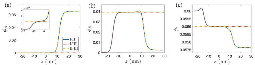圖2.I-II相界面處的物種濃度分布曲線與I-III相界面和II-III相界面的濃度分布曲線對比。藍色實線為I-II相界面的濃度分布曲線,左側為I相,右側為II相;紅色點線I-III相界面的濃度分布曲線,左側為I相,右側為III相;黃色虛線為II-III相界面的濃度分布曲線,左側為III相,右側為II相。