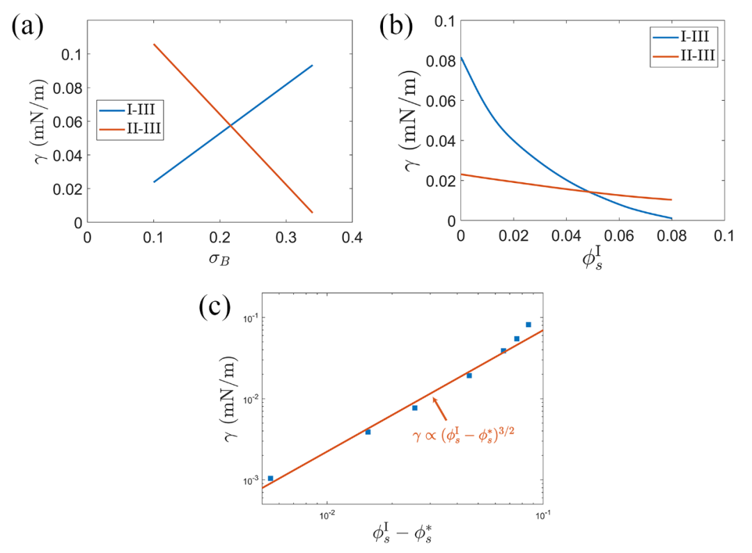 圖1.(a)I-III相與II-III相間的界面張力隨B鏈線電荷密度σB變化的曲線。(b)I-III相與II-III相間的界面張力隨外加鹽離子濃度變化的曲線。(c)接近臨界鹽時I-III相界面張力與鹽濃度之間的標度關系。