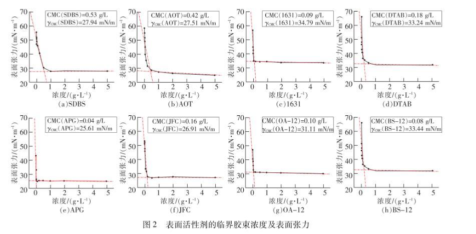 由圖2可見(jiàn),8種表面活性劑溶液表面張力隨濃度變化的趨勢(shì)大體上相同,但其臨界膠束濃度及表面張力有較大差別。溶液臨界膠束濃度越小,說(shuō)明表面活性劑分子在溶液中形成膠束的能力越強(qiáng)。8種表面活性劑的臨界膠束濃度主要集中在濃度為0.1~0.4 g/L左右,其中APG的臨界膠束濃度最小為0.04 g/L,SDBS的最大為0.53 g/L,8種表面活性劑形成膠束能力由強(qiáng)到弱排序?yàn)椋篈PG>BS-12>1631>OA-12>JFC>DTAB>AOT>SDBS,總體呈現(xiàn)出兩性型>非離子型>陽(yáng)離子型>陰離子型的規(guī)律。溶液的γcmc值越小,表面活性劑降低表面張力的能力越強(qiáng),陰離子和非離子型的4種表面活性劑γcmc值均較低,其中APG降低表面張力能力最強(qiáng),γcmc值僅為25.61 mN/m,比水降低了65.15%。而陽(yáng)離子和兩性型的表面張力較高,均在31.00 mN/m以上,1631降低表面張力的能力最弱,表面張力為34.79 mN/m。8種表面活性劑降低表面張力的能力由強(qiáng)到弱依次排序如下:APG>JFC>AOT>SDBS>OA-12>CTAB>BS-12>1631,總體而言,非離子型>陰離子型>兩性型>陽(yáng)離子型。APG的臨界膠束濃度和表面張力都最低,這可能是因?yàn)锳PG分子為環(huán)狀結(jié)構(gòu),環(huán)狀結(jié)構(gòu)的碳原子上連接有醇羥基,這些醇羥基與水分子之間存在強(qiáng)相互作用,且在水溶液中溶解度很高,因此有效降低了溶液的表面張力,也更易形成膠束。