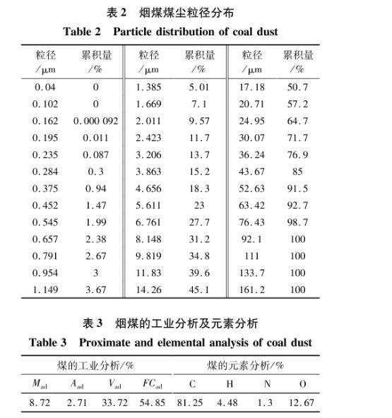 利用激光粒度分析儀對(duì)實(shí)驗(yàn)用的煤塵粒徑分布特征測(cè)試,結(jié)果見(jiàn)表2。