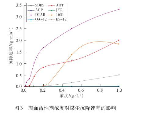 由表4和圖3可以看到,當濃度為0.1 g/L時,煤塵在AOT和APG溶液中的沉降時間不到1 min,而在陽離子和兩性型表面活性劑溶液中的沉降時間超過1 h。在同一濃度下,煤塵在不同表面活性劑溶液中的沉降時間相差較大,表面活性劑自身性質影響潤濕煤塵的作用。當濃度增大到各表面活性劑的臨界膠束濃度附近時,煤塵在陰離子和非離子表面活性劑中的沉降時間會急劇下降,縮短至5 min之內,但在陽離子和兩性型表面活性劑中沉降時間依然大于1 h??傮w而言,8種表面活性劑潤濕煤塵的能力由強到弱依次排序為:APG>AOT>JFC>SDBS>OA-12>BS-12>1631>CTAB,這與表面活性劑降低表面張力的能力排序基本一致。陽離子表面活性劑潤濕煤塵效果最差,主要是因為親水頭基的正電荷與煤塵所帶負電荷之間的靜電力大于疏水基團之間的范德華力,形成了親水基團朝向煤塵表面、疏水基團朝向水的單分子膜,不利于潤濕。APG潤濕煤塵效果最好主要與其自身結構有關,APG分子結構碳原子上的醇羥基與水分子之間存在強烈相互作用,間接弱化了烷基糖苷分子結構中親水基團與煙煤表面含氧親水官能團之間的吸附作用,更有利于疏水基團與煤塵表面的疏水基團發(fā)生強烈相互作用,以親水頭基伸向溶液,疏水尾部吸附在煤塵上的方式排列,降低了溶液及固-液界面張力,增加了煤塵親水性。APG濃度達到0.02 g/L時,煤塵沉降時間僅為057 min,沉降速率為0.18 g/min,潤濕煤塵效果良好,當濃度繼續(xù)增大,潤濕煤塵作用變化不大,綜合考慮成本及效率后,選擇濃度為0.02 g/L的APG作為低階煤用噴霧抑塵法的添加劑。