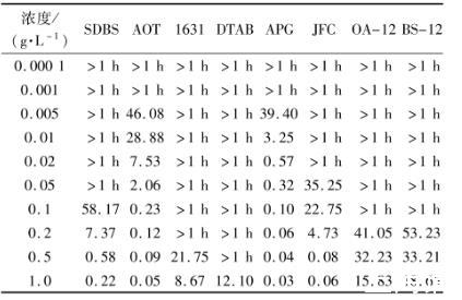 2)表面活性劑溶液的表面張力與其自身性質及濃度密切相關。8種表面活性劑溶液表面張力隨濃度的增大先減小后在臨界膠束濃度附近穩(wěn)定,其表面張力均遠小于水的表面張力。因8種表面活性劑的性質不同,臨界膠束濃度值和表面張力值分別在0.04~053 g/L和25.61~34.79 mN/m之間差異較大。8種表面活性劑按降低溶液表面張力的能力由強到弱排序為:APG>AOT>JFC>SDBS>OA-12>BS-12>1631>CTAB,非離子>陰離子>兩性型>陽離子。非離子表面活性劑APG形成膠束和降低表面張力能力均為最佳,其臨界膠束濃度為0.04 g/L,表面張力為25.61 mN/m。