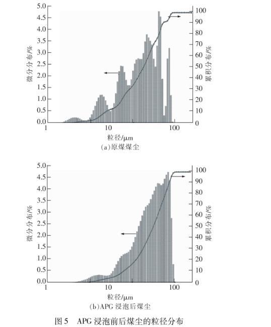 由圖5可見,經APG浸泡后煤塵粒徑增大。原煤煤塵的平均粒徑為22.62μm,經APG浸泡后增大到3518μm。浸泡前煤塵的粒徑分布不均勻,粒徑眾數為48.41μm,浸泡后煤塵粒徑的均一性增強,呈較典型的正態(tài)分布,粒徑眾數也增大至76.51μm。這說明煤塵表面親水官能團的增加和分子間締合氫鍵的形成,促使煤塵之間發(fā)生了團聚作用,使原本無法發(fā)生重力沉降的“小粒徑”煤塵變成了能夠發(fā)生重力沉降的“大粒徑”顆粒,加快了沉降速率,縮短了沉降時間,與煤塵沉降實驗結果一致。