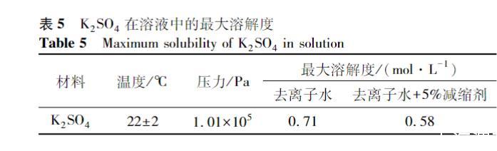 從圖4b中還可以看出,A組中SO42-的初始濃度更高,隨著水化反應的進行,SO42-被OH-取代,A組中置換出的OH-更多,OH-濃度也更高。A組中SO42-的初始濃度更高可能是因為SRA降低了孔隙溶液的極性,使得硫酸鹽溶解和電離到這種“低極性”溶劑中的能力降低。驗證這一假設需要研究硫酸鹽在SRA中的溶解情況,這里以K2SO4為例測試其最大溶解度,在10g去離子水中以0.1g每次加入K2SO4粉末。