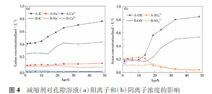 圖4減縮劑對孔隙溶液(a)陽離子和(b)陰離子濃度的影響