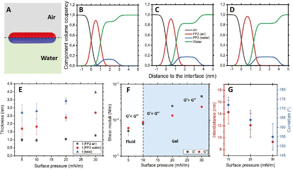 圖4、A)用于擬合NR數據的模型示意圖。B)10、C)20和D)30 mN m-1處界面的密度分布。E)通過NR獲得的纖維的總厚度。F)界面剪切流變測量。G)通過分析AFM圖像獲得纖維的間距和曲率。