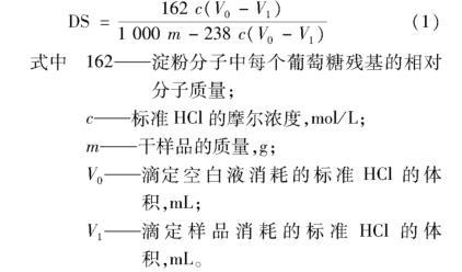稱取干燥的棕櫚酸木薯淀粉酯1 g,置于250 mL的錐形瓶中,加入25 mL蒸餾水,滴加2滴1%酚酞指示劑,用0.1 mol/L NaOH溶液滴定至粉紅色,且顏色不消失。再加入25 mL濃度0.5 mol/L NaOH標準溶液,室溫磁力攪拌60 min。用0.5 mol/L HCl標準溶液滴定至溶液紅色剛好消失,記錄所用HCl溶液體積為V1。以木薯淀粉為空白實驗。按式(1)計算取代度(DS):