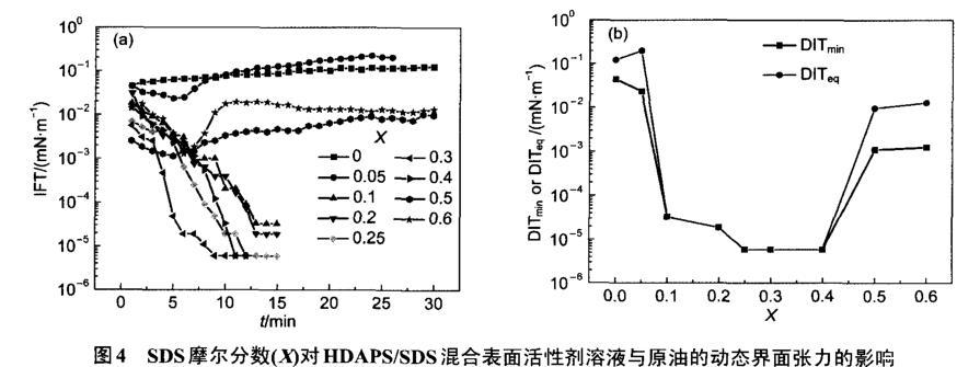 圖4 SDS摩爾分數(X)對HDAPS/SDS混合表面活性劑溶液與原油的動態界面張力的影響