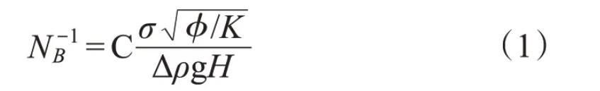 NB-1為滲吸機理判別參數,式中沒有考慮巖石潤濕性。NB-1>5時,毛管力在滲吸作用中起主導作用;1<NB-1<5時,重力和毛管力同時起作用;NB-1<<1時,重力起主導作用。