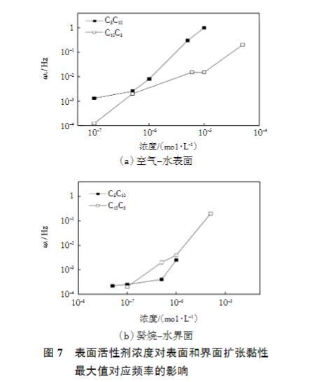 圖7表面活性劑濃度對表面和界面擴張黏性最大值對應頻率的影響