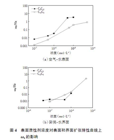 表面活性劑濃度對表面和界面擴張彈性全頻率譜上ω0的影響如圖4所示。擴張彈性數值達到平臺,意味著擾動過程中組成界面膜的分子不與體相間發生交換,同時,界面上的分子也不能通過取向變化耗散能量。也就是說,ω0大于界面及其附近所有弛豫過程的特征頻率。