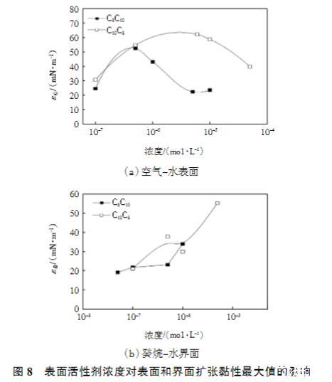 圖8表面活性劑濃度對表面和界面擴張黏性最大值的影響