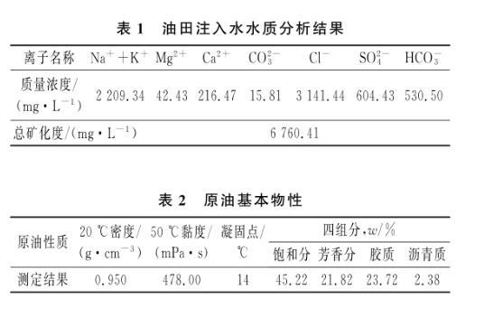 (1)主要材料。脂肪醇聚氧乙烯醚硫酸鈉、十二烷基苯磺酸鈉、十二烷基硫酸鈉,成都科龍化工試劑廠生產;十六烷基二甲基甜菜堿、烷基糖苷APG1214,臨沂綠森化工有限公司生產,上述藥品均為工業級。實驗用水為油田注入水,水質分析結果見表1;實驗用油為X油田原油,其基本物性見表2。