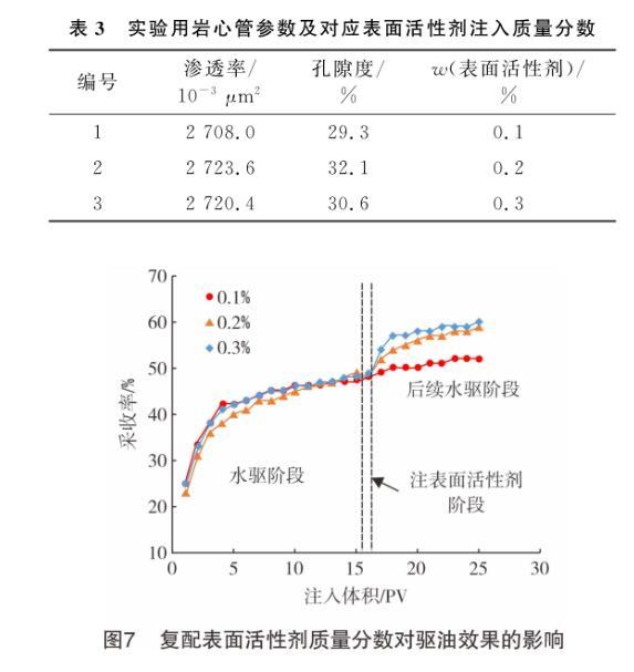 圖7為復(fù)配表面活性劑在模擬油藏條件下的巖心管(巖心管具體參數(shù)及對應(yīng)表面活性劑的注入質(zhì)量分?jǐn)?shù)見表3)驅(qū)油實(shí)驗(yàn)效果。由圖7可知,注入不同質(zhì)量分?jǐn)?shù)的復(fù)配表面活性劑后,后續(xù)水驅(qū)階段原油采收率均比前期水驅(qū)階段有所提高。當(dāng)表面活性劑質(zhì)量分?jǐn)?shù)分別為0.1%、0.2%和0.3%時(shí),采收率分別提高了5.8%、9.4%和10.3%。通過對比質(zhì)量分?jǐn)?shù)大小與采收率增幅發(fā)現(xiàn):當(dāng)表面活性劑質(zhì)量分?jǐn)?shù)由0.1%增至0.2%時(shí),采收率增加了3.6%;當(dāng)表面活性劑質(zhì)量分?jǐn)?shù)由0.2%增至0.3%時(shí),采收率僅增加了0.9%。因此,從成本角度考慮,建議將表面活性劑的使用質(zhì)量分?jǐn)?shù)控制在0.2%~0.3%。