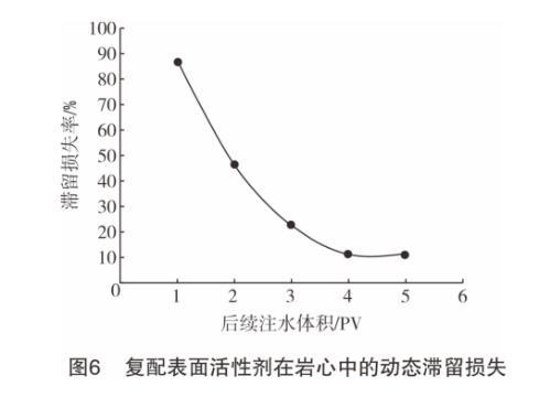 從圖6可知:隨著后續(xù)注水量的增加,表面活性劑在巖心中的滯留損失率呈下降趨勢;當(dāng)后續(xù)注水量≥4 PV時(shí),滯留損失達(dá)到恒定;恒定時(shí)的滯留損失率較小,僅為11.2%。這一結(jié)果與復(fù)配表面活性劑和巖石壁面間的相互作用能有關(guān)。由于砂巖表面帶負(fù)電,而復(fù)配表面活性劑中十六烷基二甲基甜菜堿親水端同時(shí)含陰、陽離子,烷基糖苷APG1214親水端為非離子,因此表面活性劑和巖石壁面間的相互作用能較大。相互作用能越大,吸附量越小,造成的滯留損失也就越小。