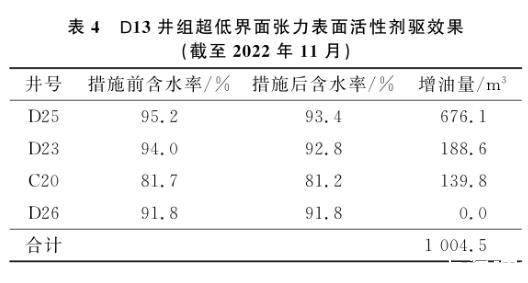 油藏評估結(jié)果顯示,D13井所控區(qū)域剩余可采儲量約6.7×104m3,剩余可采儲量較大。為挖掘該井所控區(qū)域油藏潛力,2022年4月開始對該井進(jìn)行超低界面張力表面活性劑驅(qū)油先導(dǎo)性試驗(yàn),2022年10月結(jié)束,共計(jì)注入表面活性劑溶液3 600 m3。考慮到滯留損失,試驗(yàn)將表面活性劑質(zhì)量分?jǐn)?shù)設(shè)計(jì)為0.3%。在注入過程中,注入壓力由8.9 MPa逐漸上升至10.2 MPa,分析認(rèn)為表面活性劑在地層中將剩余油乳化,乳化形成的油滴產(chǎn)生疊加的賈敏效應(yīng)所致。從表3的試驗(yàn)結(jié)果可知,截至2022年11月,施工結(jié)束1個(gè)月后,D13井對應(yīng)4口生產(chǎn)井中,除D26井因注采井距相對較遠(yuǎn),尚未見效外,其余3口井均已開始逐漸見效。見效井含水率下降0.5%~1.8%,1個(gè)月內(nèi)已實(shí)現(xiàn)在水驅(qū)基礎(chǔ)上增油1 004.5 m3,這說明超低界面張力表面活性劑能實(shí)現(xiàn)剩余油的有效啟動(dòng)。