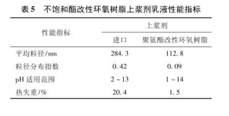由表5結果可見:不飽和酯改性環氧樹脂上漿劑為微乳液,平均粒徑更小,離心沉淀量低,更易長時間儲存應用;可在較寬的pH范圍內保持穩定,熱失重程度小,耐溫性高,可滿足各種不同復合材料樹脂基體高溫、中溫、低溫加工工藝的需求。