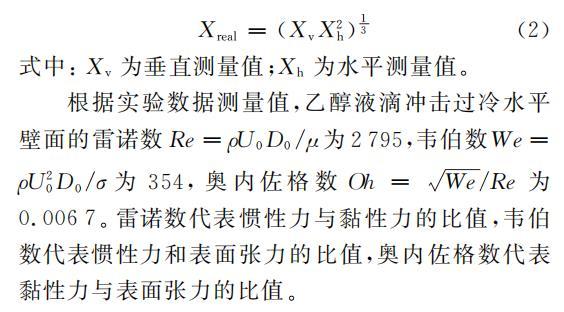 根據實驗數據測量值,乙醇液滴沖擊過冷水平壁面的雷諾數Re=ρU0D0/μ為2795,韋伯數We=ρU20D0/σ為354,奧內佐格數Oh=We/Re為0.0067。雷諾數代表慣性力與黏性力的比值,韋伯數代表慣性力和表面張力的比值,奧內佐格數代表黏性力與表面張力的比值。