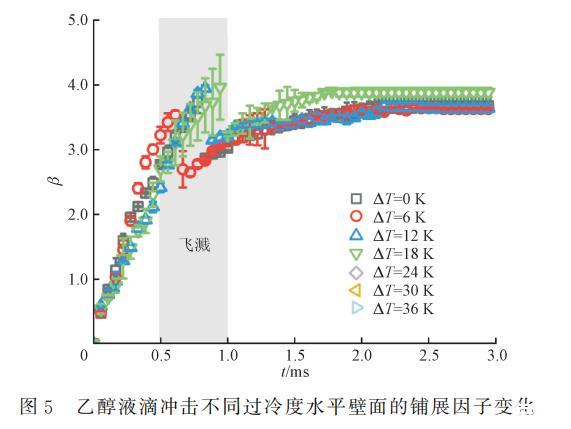 為了探究水平壁面過冷度對液滴沖擊的影響機制,定義無量綱鋪展因子β=D(t)/D0,其中D(t)為液滴每一時刻的直徑,Dmax為液滴能達到的最大鋪展直徑,對應的最大鋪展因子為βmax=Dmax/D0。圖5展示了不同水平壁面過冷度下,乙醇液滴沖擊水平壁面的鋪展因子β隨時間的變化曲線??梢钥闯?,乙醇液滴沖擊不同過冷度水平壁面均在1.0ms內發生破碎-飛濺,在這段時間內,鋪展速率近似為線性,在飛濺后,β突然減小,隨后鋪展因子繼續增,鋪展速率逐漸減小,最終趨于0,液滴形態不再發生變化。