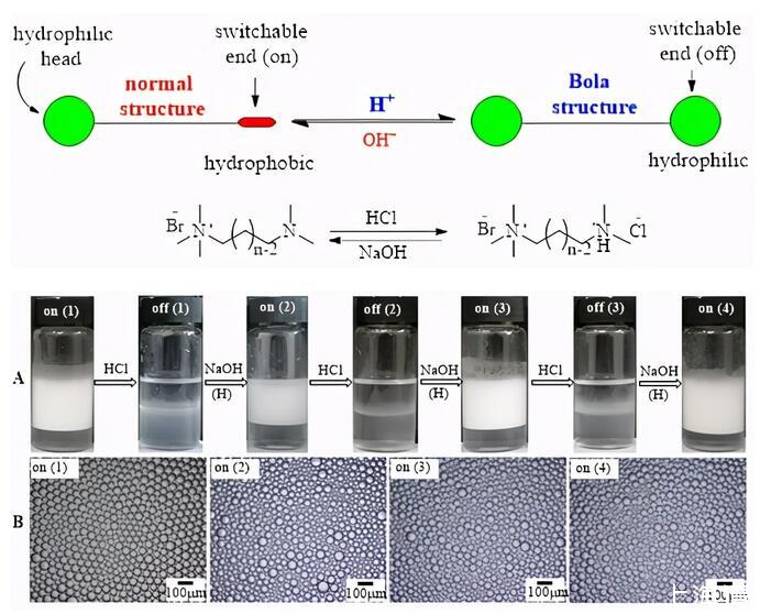 智能表面活性劑對于構建刺激-響應性自組裝/分散體系和實現表面活性劑的循環利用具有重要意義。然而現有的智能表面活性劑在結構上類似于常規表面活性劑,一般以親水的頭基作為響應基團,通過環境刺激使其在親水和疏水兩種狀態之間可逆轉變。其缺點是,在油-水體系中,失活后的表面活性劑將轉移到油相,一方面影響油相的純度和性質,另一方面給回收和再利用帶來障礙。