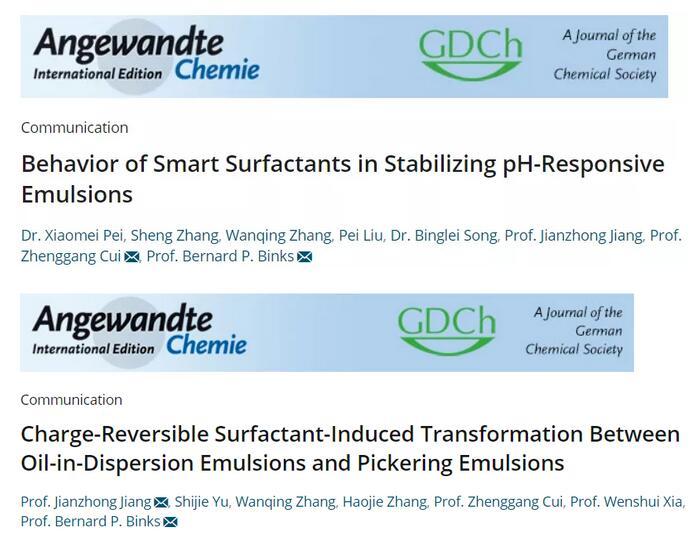 近期,江南大學蔣建中-崔正剛科研團隊在新型智能表面活性劑設計開發領域取得突破性研究進展,連續在Angew.Chem.Int.Ed.上發表2篇研究論文:“Behavior of smart surfactants in stabilizing pH-responsive emulsions,Angew.Chem.Int.Ed.2021,60,5235-5239(通訊作者崔正剛教授和B.P.Binks教授)”和“Charge-reversible surfactant-induced transformation between oil-in-dispersion emulsions and Pickering emulsions,Angew.Chem.Int.Ed.2021,60,11793-11798(通訊作者蔣建中教授和B.P.Binks教授)”。