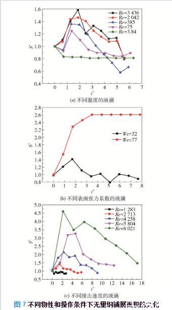 圖7不同物性和操作條件下無量綱鋪展面積的變化