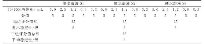 參照GB 7381-87所述方法,對合成得到的氟硅表面活性劑FSS在硬水中的穩(wěn)定性進(jìn)行了測定,結(jié)果如表3.