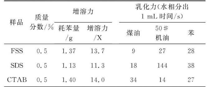 增溶力和乳化力也是表面活性劑的重要性能指標(biāo),表2列出了FSS的乳化力和增溶力測試結(jié)果,并與SDS、CTAB的性能進(jìn)行對比。