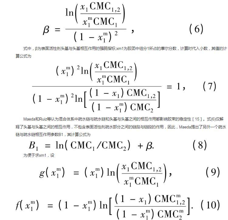 式中,β為表面活性劑頭基與頭基相互作用的強弱指標;xm1為膠團中組分1所占的摩爾分數,計算時代入小數,其值的計算公式為