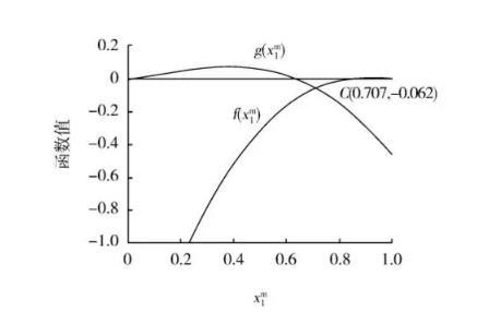 圖2 g(x m1)和f(x m1)關于x m 1的曲線