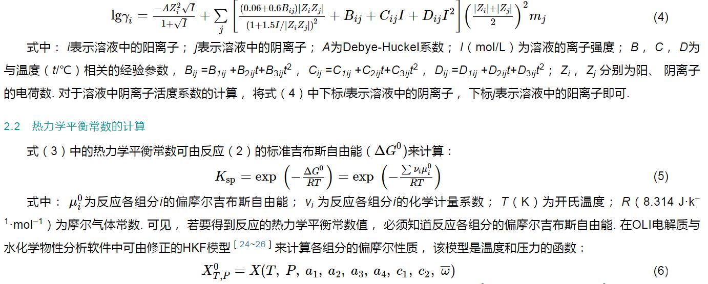 因此,式(3)中離子的活度系數(shù)可由OLI電解質(zhì)與水化學(xué)物性分析軟件[20]內(nèi)嵌的Bromley-Zemaitis方程[22,23]來(lái)計(jì)算: