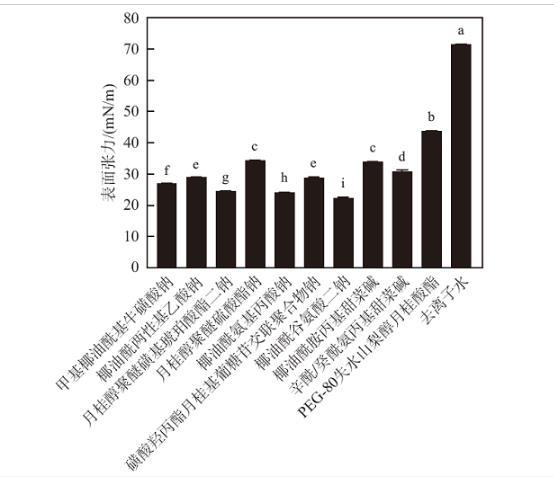 將10種表面活性劑的去離子水溶液(pH=6.0)進行表面張力測定,結果如圖1所示。去離子水的表面張力為71.81 mN/m;所有表面活性劑均可顯著降低去離子水的表面張力,其中PEG-80失水山梨醇月桂酸酯降低表面張力的能力最差,為43.73 mN/m;月桂醇聚醚硫酸酯鈉和椰油酰胺丙基甜菜堿水溶液的表面張力無顯著差異,分別為34.14和33.87 mN/m;辛酰/癸酰氨丙基甜菜堿水溶液的表面張力為30.54 mN/m;椰油酰兩性基乙酸鈉和磺酸羥丙酯月桂基葡糖苷交聯聚合物鈉水溶液的表面張力無顯著差異,分別為28.88和28.71 mN/m;甲基椰油酰基牛磺酸鈉水溶液的表面張力為26.74 mN/m;月桂醇聚醚磺基琥珀酸酯二鈉水溶液的表面張力為24.16 mN/m;椰油酰氨基丙酸鈉水溶液的表面張力較低,為23.84 mN/m;椰油酰谷氨酸二鈉水溶液的表面張力最低,為22.08 mN/m。