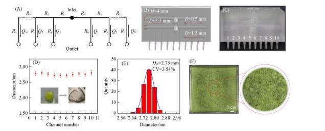 在確定平行放大微流控器件通道結(jié)構(gòu)尺寸設(shè)計(jì)后,通過SolidWorks建立三維模型,并利用光固化3D打印機(jī)直接打印微流控器件。實(shí)驗(yàn)表明,10個并排微流控通道均可以穩(wěn)定生成水/水微囊,并且所生成的微囊具有較一致的尺寸大小和較均勻的分散性。綜合統(tǒng)計(jì)10個微流控通道形成的微囊分布,可以得到D=(2.75±0.10)mm.在10個平行微流控通道設(shè)計(jì)下,水/水微囊的產(chǎn)率可以達(dá)到0.5 kg/h,并可依據(jù)相同原理,進(jìn)一步增加平行通道的數(shù)量,提高產(chǎn)率,實(shí)現(xiàn)尺寸均一水/水微囊的高通量制備。