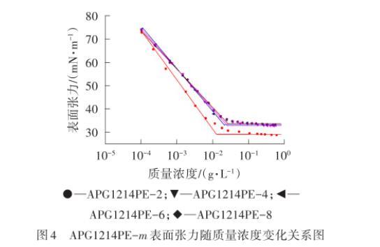 圖4 APG1214PE-m表面張力隨質(zhì)量濃度變化關(guān)系圖