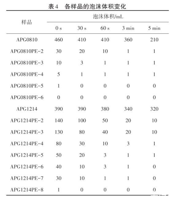 泡沫是氣體在液體中的分散體系,氣體成為氣泡被連續(xù)相的液體分隔開,氣體是分散相,液體是分散介質(zhì)。在大規(guī)模的洗滌和印染工業(yè)中,泡沫給操作帶來不便,因此新型的低泡表面活性劑越來越受關(guān)注。由表4可以看出,PO基團引入APG中明顯地降低了泡沫的形成和穩(wěn)定性,而且在相同PO加合數(shù)下,APG0810變化更明顯,因此制備的系列樣品屬于低泡表面活性劑。