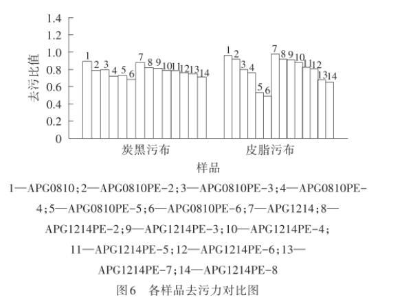 污垢通過不同的相互作用力在物品表面附著,而應(yīng)用表面活性劑去除的污垢一般是通過物理吸附(范德華力、偶極相互作用)或者靜電作用而附著于物品上。去污力是指將固體表面浸泡在一定的液體介質(zhì)中去除污垢的能力,使用洗滌劑減少污垢在固體表面的附著量,利用機械力使污垢與固體表面分離。由圖6可以看出,無論是皮脂污布還是炭黑污布,制備的APG0810PE-n和APG1214PE-m的去污比值都低于對應(yīng)的原料APG0810和APG1214,而且隨著PO加合數(shù)的增加而降低,可能是由于PO基團的引入使得分子的疏水性提高。但整體來看,PO改性APG獲得的產(chǎn)品去污性能仍處于較好的水平。