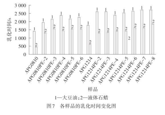 由圖7可以看出,采用乳液破乳時間表征表面活性劑的油水界面性質(zhì),APG1214和APG1214PE-m乳化大豆油以及液體石蠟的能力勝于APG0810以及APG0810PE-n,而且隨著PO加合數(shù)的增加而提高。這是由于PO基團和烷基鏈增長提供了疏水性,增強了乳化劑分子的乳化能力,延長了破乳時間。此外,所有表面活性劑乳化大豆油的能力均明顯強于乳化液體石蠟,表明PO基團可能具有類似極性作用,可以增強樣品與極性分子之間的協(xié)同作用,因此乳化性能更好。