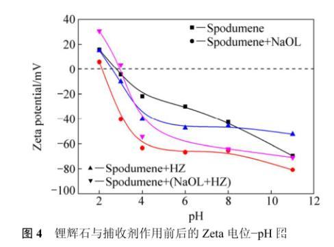 圖4鋰輝石與捕收劑作用前后的Zeta電位?pH圖