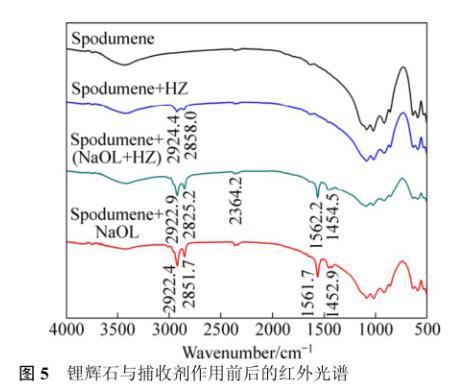 鋰輝石與不同藥劑作用前后的紅外光譜如圖5所示,鋰輝石與NaOL作用后在2922.4和2851.7 cm?1波長處都有峰存在,在此波長范圍內為甲基(—CH3)、亞甲基(—CH2—)的伸縮振動共振峰,表明NaOL在鋰輝石表面有吸附作用。在1561.7和1452.9 cm?1波長處有新峰產生,其中1452.9 cm?1波長處為亞甲基(—CH2—)的變形振動共振峰,1561.7 cm?1處為油酸鋁的吸收峰,表明NaOL在鋰輝石表面生成了新的物質,新峰產生表明這種吸附作用是化學吸附。鋰輝石與HZ作用后在2924.4和2858.0 cm?1波長處都有峰存在,在此波長范圍內為甲基(—CH3)、亞甲基(—CH2—)伸縮振動共振峰,表明HZ在鋰輝石表面有吸附作用。而鋰輝石與HZ藥劑作用后,光譜圖譜中沒有新峰產生,表明這種吸附不是化學吸附,HZ是一種非離子型捕收劑,它在鋰輝石表面的吸附不是靜電吸附,結合Zeta電位結果分析推測這種吸附可能是氫鍵作用。鋰輝石與(NaOL):(HZ)=5:1組合捕收劑作用有新的峰產生,但仍是和鋰輝石與NaOL作用后的吸收峰類似,表明捕收劑經過組合后,HZ并沒有和NaOL生成新的物質從而改變吸收峰的位置。