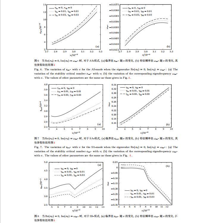 給定生長條件,令量子化條件(59)式、(64)式、(69)式和(74)式中Re(σ0)=0,Im(σ0)=ω?=0,用數(shù)值的方法計算AA-,AS-,SA-和SS-模式對應(yīng)的穩(wěn)定臨界值εaa?,εas?,εsa?和εss?.這四種振蕩不穩(wěn)定模式導(dǎo)致了所謂的全局不穩(wěn)定性機(jī)理,圖5—圖8給出了四種震蕩不穩(wěn)定模式的穩(wěn)定臨界值εaa?,εas?,εsa?和εss?隨著υ的變化圖.從圖5、圖7和圖8可以看出,隨著各向異性表面張力系數(shù)增大,穩(wěn)定臨界值εaa?,εsa?和εss?隨之減小.這就意味著各向異性表面張力減小片層共晶生長的穩(wěn)定性區(qū)域,增強(qiáng)了AA-,SA-和SS-這三種全局震蕩模式的全局不穩(wěn)定性;然而,對于AS-全局震蕩模式而言,從圖6可以看出,隨著各向異性表面張力系數(shù)增大,穩(wěn)定臨界值εas?隨之增大.這就意味著,各向異性表面張力增大片層共晶生長的穩(wěn)定性區(qū)域,減弱了AS-全局震蕩模式的全局不穩(wěn)定性.