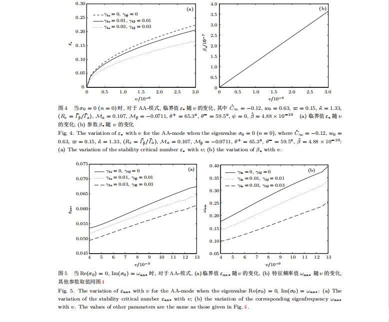 由量子化條件可以看出特征值σ0是關(guān)于參數(shù)ε和γ4的隱函數(shù).任意給定參數(shù)ε和γ4,可以得到一個復(fù)數(shù)值σ0.為了更好地闡明生長條件對共晶生長系統(tǒng)的影響,引入無量綱參數(shù)[11,12]υ=?c,αV/κD,它反映拉速V的大小;?β=??c,α(G)D/mαCe,它反映溫度梯度(G)D的大小.通過化簡可以知道,υ=ε3ˉΓα,?β=υG/M.本文采用與Xu[23]研究枝晶的形態(tài)穩(wěn)定性相似的方法,對于四種震蕩模式得到各自對應(yīng)的穩(wěn)定臨界值εaa?,εas?,εsa?和εss?.共晶生長系統(tǒng)穩(wěn)定的選擇判據(jù)為: