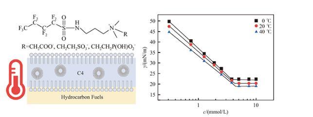 然而不同溫度對表面活性劑的性能可能有一定程度的影響。尤其是機場消防領域,由于我國機場分布較廣,消防車滅火需要就近取水,各機場在冬季和夏季的消防用水水源溫度差異較大(一般在0~40℃)。在低溫下氟碳表面活性劑的性能可能會受到影響,進而影響AFFF的滅火性能。我國國標中也僅對泡沫在室溫下的性能指標有所要求,并未嚴格考慮溫度的影響。因此,將溫度作為影響因素進行研究,能夠指導表面活性劑的有效應用。本文在溫度為0~40℃的范圍下,研究三種接枝不同親水基團的基于短碳氟鏈的甜菜堿型兩性氟表面活性劑的一系列理化性質,為此類表面活性劑在不同溫度環境下的應用提供理論依據。