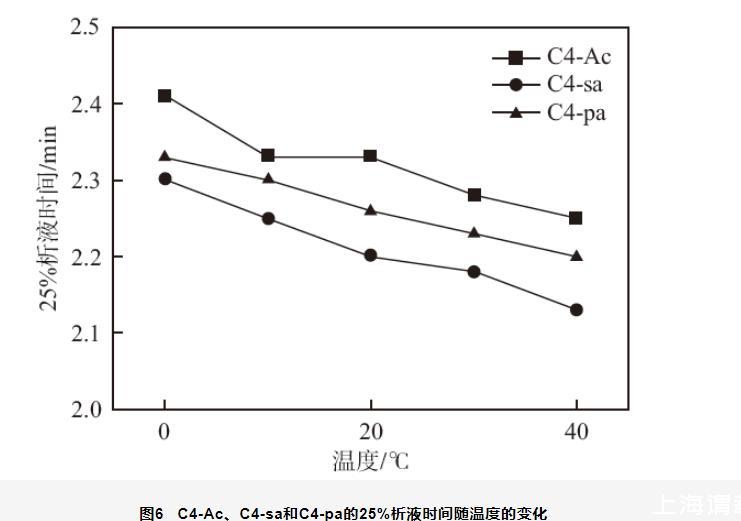 圖6 C4-Ac、C4-sa和C4-pa的25%析液時(shí)間隨溫度的變化